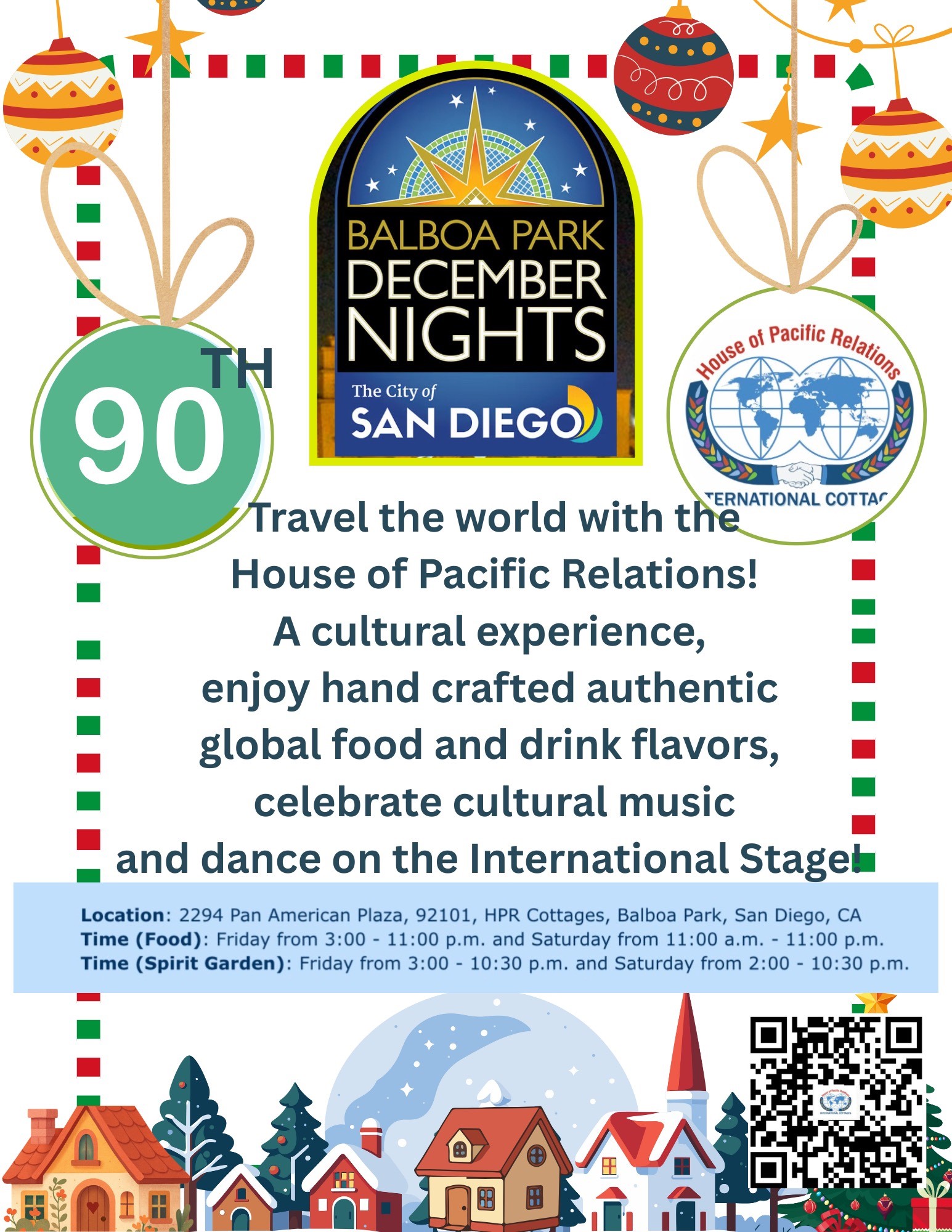Visit the international cottages during December Nights for delicious foods and beverages from the many cultures represented by the HPR. Enjoy music and dance on the international cottages stage. The houses will be serving food from the cottages, from food tents or from both. Visit our International Spirit Garden for beverages from around the world. This is the HPR's 90th anniversary in Balboa Park, so be sure to stop by and celebrate with us.